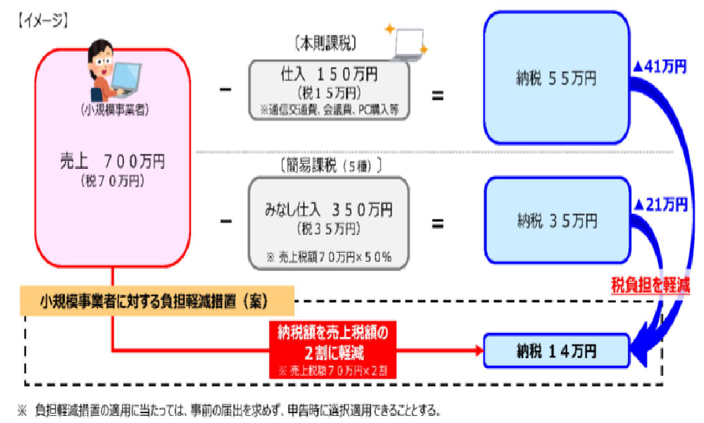 免税事業者がインボイス発行事業者を選択した場合、納税額を売上税額の2割に軽減する措置です。
