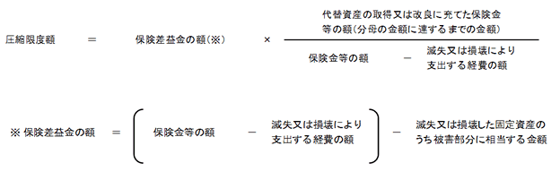 有する固定資産の滅失又は損壊により、保険金の支払いを受けた事業年度において、その滅失した固定資産に代替する同一種類の固定資産(以下、「代替資産」という。)を取得するか、又は損壊を受けた固定資産や代替資産となるべき資産の改良をした場合は、圧縮限度額の範囲内で帳簿価額を損金経理することにより減額、または、確定した決算において積立金として積み立てる方法等により経理したときは、その減額または経理した金額を損金の額に算入することができます。