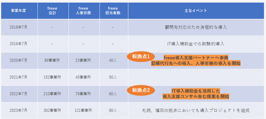 その中で、freee社からの委託を受けて取り組んだ導入支援パートナーへの参画を経て、ソフトの本質的な部分まで踏み込んでクライアントへの導入支援を行う取り組みを推進することが出来た点が1点目の転換点でした。これにより、社内にもfreeeに精通するスタッフを広めることができ、全社展開のきっかけとすることができたわけです。