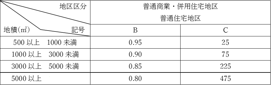 通常の評価方法による1㎡当たりの評価額×規模格差補正率×土地の面積 ※規模格差補正率=(A×B+C)/土地の面積(A)×0.8