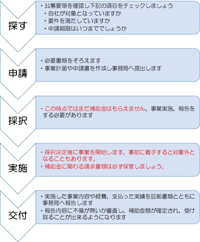 詳細は各種補助金のホームページ、最新の公募要領をご参照ください。補助金名をクリックしていただくと直接アクセスできます。