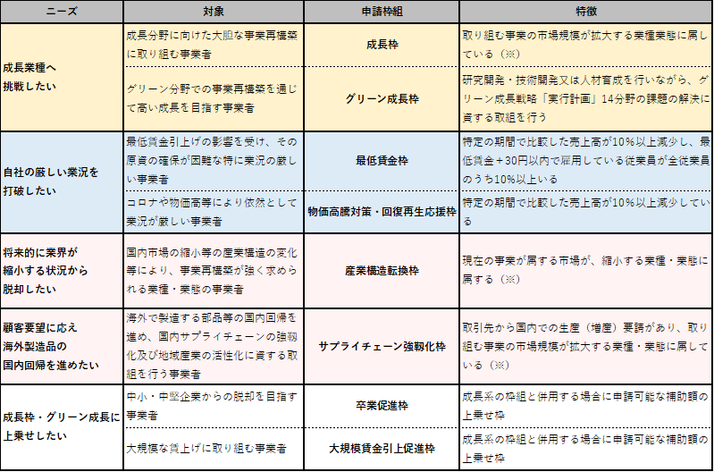 今回は、コロナ禍の影響を受けている企業だけでなく、成長分野に向けた事業再構築に取り組む企業も対象となる「成長枠」という申請枠組が創設されたことが大きな変更点です。また、「サプライチェーン強靭化枠」という海外製造品の国内製造回帰を促す枠組みも作られていますが、対象企業として規模の大きな企業に限られるかもしれません。
