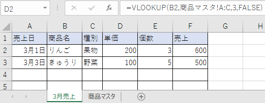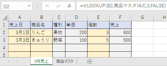 上の画像では、商品名を入力すると、別のシートから種別、単価が自動的に連動されるように数式が入力されています。