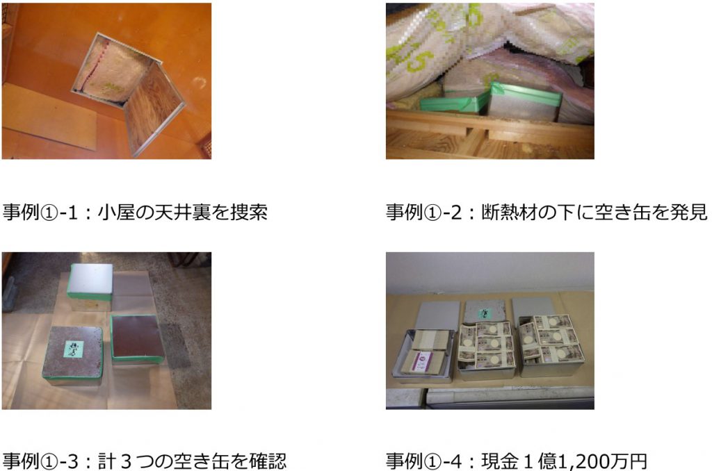 小屋の天井裏、階段下収納、蔵に置かれた木箱、そして銀行の貸金庫…。一体何の話かと不思議に思われるかもしれませんが、これらは脱税によって収得した不正資金が隠匿されていた場所の具体例です。小屋の天井裏を査察が捜索した際の写真が提供されていましたので、ご参考までにご覧に入れます。