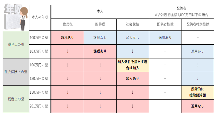 年収の壁は「社会保険上の壁」である106万円、130万円と、「税務上の壁」である100万円、103万円、150万円、201万円に区分されます。