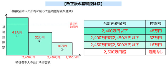 基礎控除額を現行38万円から一律10万円引き上げ、同時に合計所得金額が2,400万円を超える個人については、その金額に応じて控除額が逓減し、2,500万円超で控除額が消滅するように調整します。