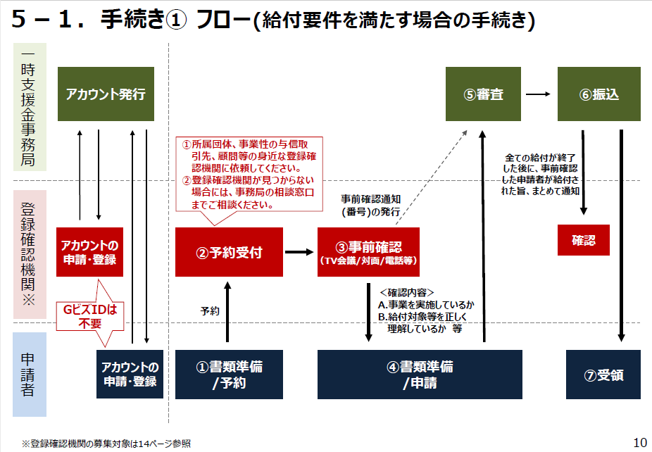 登録確認機関において事前の確認を受け、事業の実施や一時支援金の給付対象等の正しい理解が確認された場合には、一時支援金事務局のWEBページから申請をします。