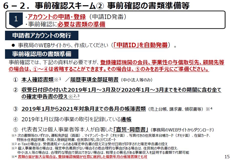 事務局が募集・登録した「登録確認機関」により、「帳簿等の事務局が定めた書類の有無」や「宣誓内容等に関する質疑応答」等の形式的な事前確認が必要となります。