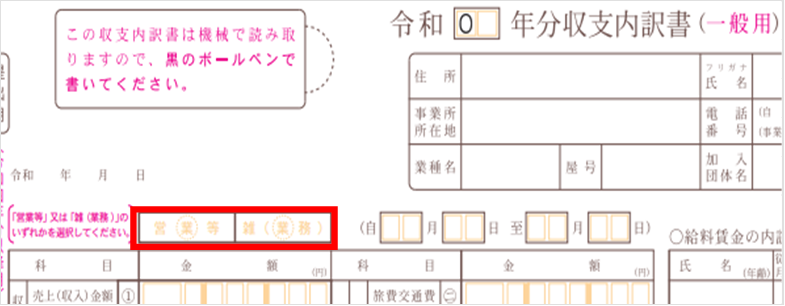 2022年分(令和4年分)の確定申告から、収支内訳書(一般用)の1ページ目に「営業等」と「雑(業務)」の選択欄が追加されました。