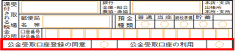 下記の「還付される税金の受取場所」に記載した預貯金口座を公金受取口座として登録する場合には、「公金受取口座登録の同意」に〇を記入します。