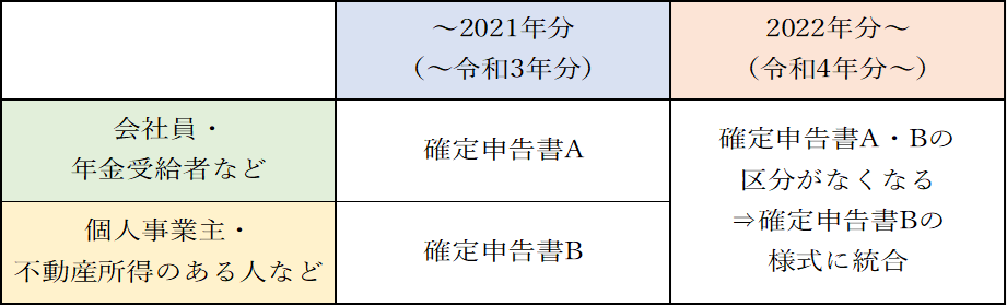 これまで「確定申告書A」は、主に給与所得者である会社員や年金受給者などが使用しており、「確定申告書B」は、主に個人事業主や不動産所得のある人などが使用しておりましたが、「確定申告書A」の廃止後はどちらも「確定申告書B」に統合された、「令和〇年分の所得税及び復興特別所得税の申告書」を使用します。(以下の図参照)