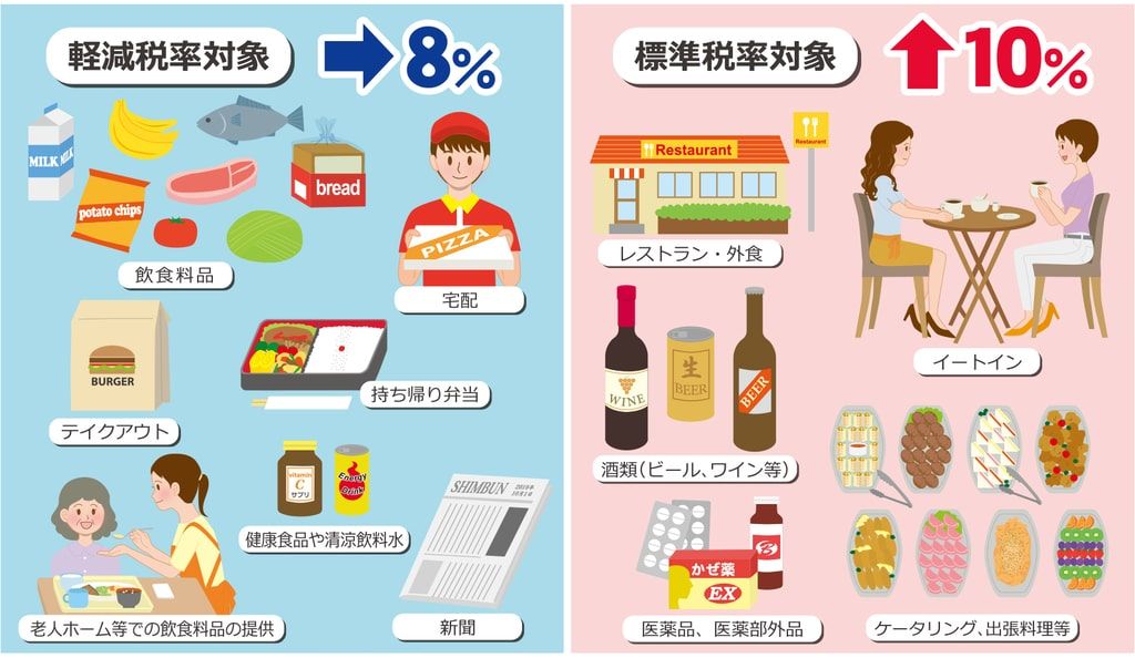 2019年10月1日以降、飲食料品(酒類、外食を除く)と新聞(定期購読で週2回以上発行)に軽減税率が適用されます。
