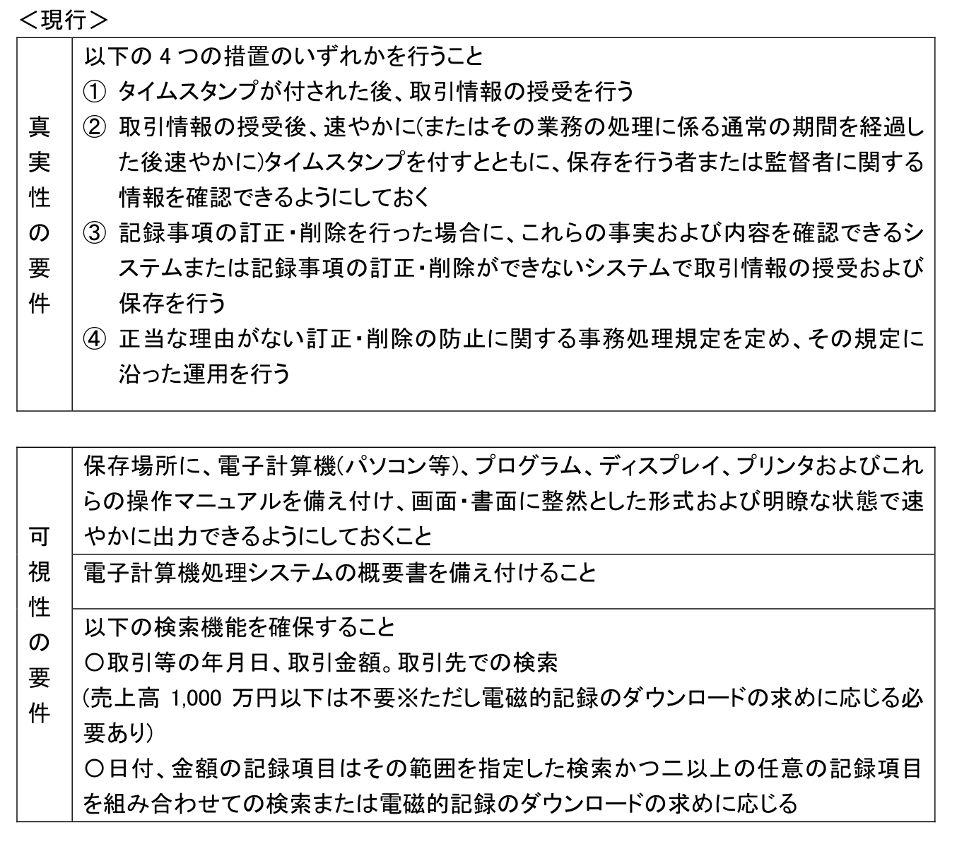 2022年(令和4年)1月1日以降、電子取引で請求書等を授受した場合、以下の要件を満たして取引データを保存する必要があります。