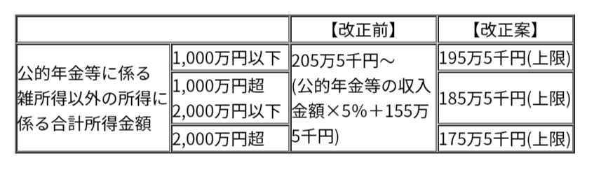 4.公的年金等に係る雑所得以外の所得に係る合計所得金額が2,000万円超である場合、 上記①及び②の見直し後の控除額から更に一律20万円引き下げられます。