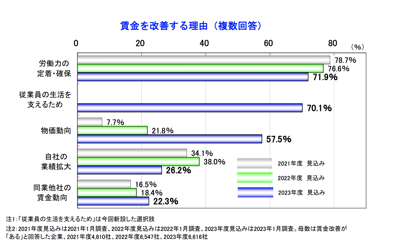 以下のとおり、賃金を改善する理由として最も多くの企業が「労働力の定着・確保」と回答し、次に「従業員の生活を支えるため」と回答しています。少子高齢化が進み、生産年齢人口が減少していく中で、人材の獲得・定着させることは簡単なことではありませんが、自社の未来を担う優秀な人材をより多く獲得・定着させるための、いわば先行投資として賃上げを行い、競争力の強化を図る企業が多いといえます。