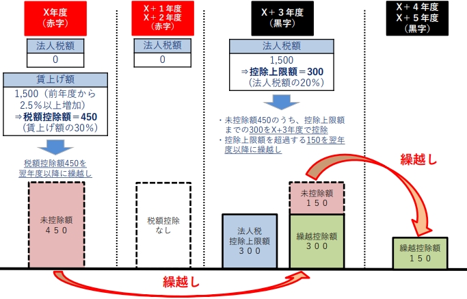 また、繰越税額控除制度を適用するには、繰越控除をする事業年度においてのみ対前年比1.5%以上もしくは2.5%以上の賃上げが必要となり、その他の事業年度(上記X+2~X+5年度)において賃上げ要件は不要となる点もご留意ください。
