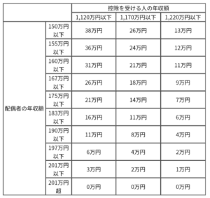 平成29年度の税制改正により、新たに控除を受ける人について所得制限が設けられることになりました。控除を受ける人の年収が1,120万円を超えると、下図のとおり配偶者控除額が段階的に減少していきます。1,220万円を超える場合については、配偶者控除の適用できないことになりますので注意が必要です。