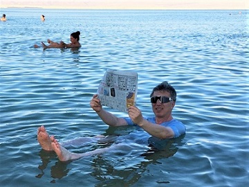 タイトルは、「死体が浮かぶ」ではなく、「死海に浮かぶ」ですが(笑)、死海の塩分濃度は海水の10倍もあることから、湖水の比重が大きくなり、それだけ浮力が生じて、人やモノが浮くというわけです。ガイドブックに載っている写真を「理屈では分かっていても、ホンマに浮いているのかな?」と懐疑的に眺めていましたが、実際に体験してみると、意外と簡単に浮いたのは少々驚きでした。