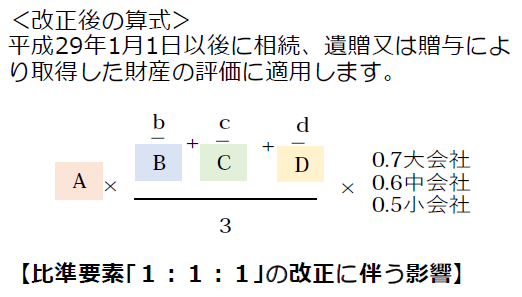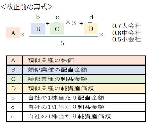 これまでの計算方法では、利益金額の割合が“3”と大きく、業績のよい企業ほど自社株の評価額が高くなっていましたが、今回の改正により、利益金額の割合が3/5(60%)から、1/3(33%)へと小さくなったため、好業績企業にとって税の負担は軽くなったといえます。