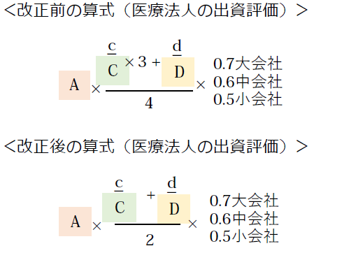 比準要素の見直しは、「持分の定めのある医療法人」の出資の評価額にも影響します。これまでの医療法人の比準要素は「利益3:純資産1」でしたが、「1:1」に変更となりました。利益の高い医療法人にとって、利益の比準要素が3/4から1/2になることは評価額の引き下げ効果が見込めますが、反対に簿価純資産価額は1/4から1/2と割合が大きくなりましたので、簿価純資産価額の大きい医療法人では評価額の引き上げにつながるケースが増加しそうです。