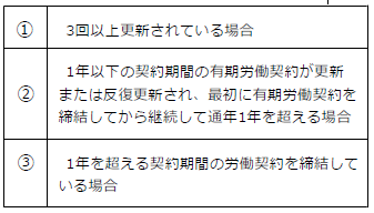 有期労働契約が5年を超えて反復更新された場合、労働者の申込みにより無期労働契約に転換します。(労働契約法第18条)