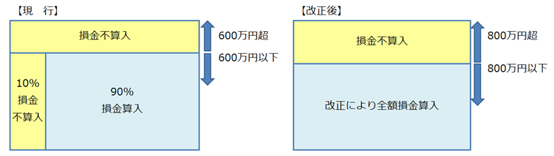 この600万円を定額控除限度額といい、今回の改正でこの金額が800万円に増えるとともに定額控除限度額までの金額の10%を損金不算入にする制度も廃止されました。