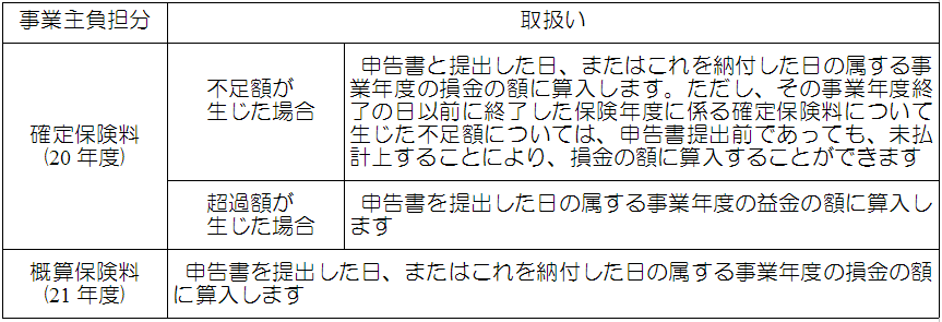 ※今回の期限の改定では、特に6月決算法人について注意が必要です。6月決算法人で、6月中に労働保険申告書を提出又は保険料を納付した場合は、21年度の概算保険料についても損金算入できますが、7月になってから申告書を提出した場合で、保険料も7月に納付したときは、21年度の概算保険料を損金算入できません。