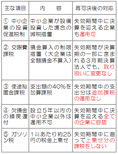 3月末で期限切れとなった26に及ぶ租税特別措置のうち「中小企業の投資促進税制」などの納税者に有利な規定(23項目)については、「不利益遡及」の問題もなく、政令の規定により4月1日に遡って適用されることになりました。
