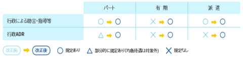 これまでもパートタイム労働者、派遣労働者については行政による助言・指導に関する規定はありましたが、改正後は有期雇用労働者も同様の扱いとなります。また、行政ADR(裁判外紛争解決手続)の根拠規定が整備されたことで、都道府県労働局において無料、非公開のADRが行えるようになりました。均衡待遇や待遇差の内容・理由に関する説明についても、ADRの対象となるため、行政機関を活用して、労働紛争の解決を図る選択が広がります。