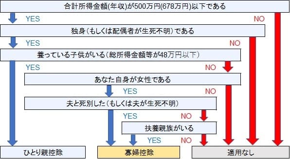 令和元年分以前より設けられていた寡婦(寡夫)控除の問題点を解消するため、ひとり親控除を創設し、寡婦控除の要件が改められました。令和2年分より適用されますので、以下のフローチャートでご確認ください。