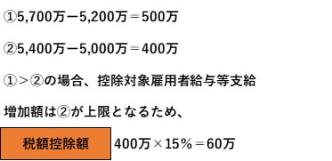 ただし、ここでも注意しなければならないのが「雇用調整助成金」の取扱いです。適用要件の判定においては控除しないものとされましたが、税額控除の計算においては下記の計算例のとおり、①雇用調整助成金を控除しないで計算した控除対象雇用者給与等支給増加額と、②雇用調整助成金を控除して計算した給与等の増加額(調整雇用者給与等支給増加額)のいずれか低い金額に15%を乗じることになります。
