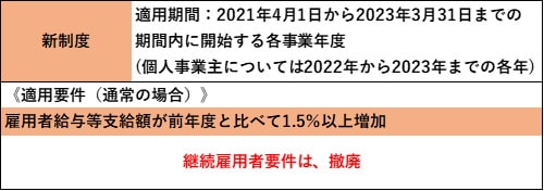 雇用者給与等支給額が、前年度と比べて1.5%以上増加していることのみです。(上乗せ要件については割愛)詳しくは、下記の「旧制度との比較」に記載の通りですが、要件が緩和されていることがお分かりいただけると思います。