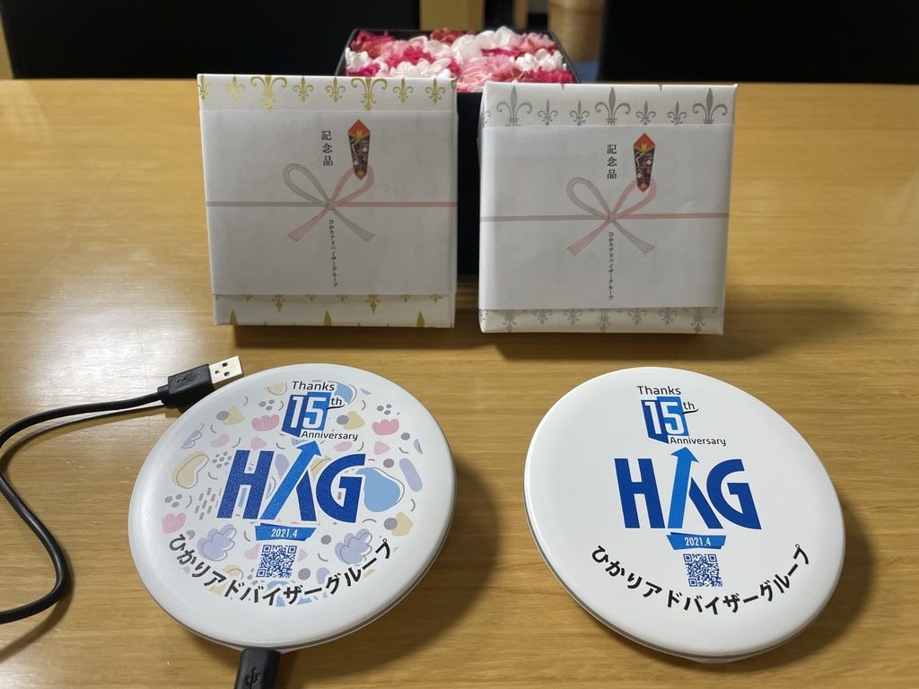 私たち、ひかりアドバイザーグループが本年で結成15周年を迎えることをご案内しておりましたが、時節柄、感謝の集いなどの記念行事を開催することが難しいため、これに代わる記念の品物について検討した結果、記念ロゴ入りの「置くだけで充電できるスマホ充電器」を制作しました。日頃お世話になっている関係者の皆様には訪問の際等に順次謹呈いたしますので、ご笑納いただければ幸いです。