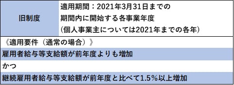 旧制度については、雇用者給与等支給額が前年度より増加していることと、継続雇用者給与等支給額が前年度と比べて1.5%以上増加していることが適用要件となっていました。