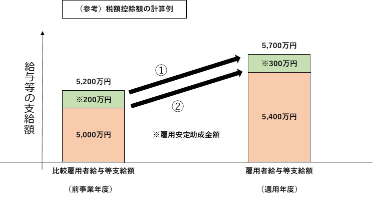 税額控除の金額については、基本的に適用年度の給与等から前年度の給与等を差し引いた増加分(以下、控除対象雇用者給与等支給増加額)の15%を法人税額(所得税額)から控除します。