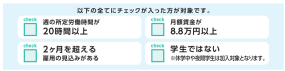 新たに社会保険加入の対象となるのは、以下のすべての条件を満たすパート・アルバイトの方です。