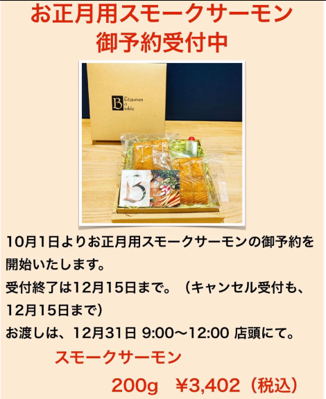10月1日より「おせち料理・お正月用スモークサーモン」の御予約受付が始まりました。 数に限りがありますので、ご興味がある方はご予約をお願いします。