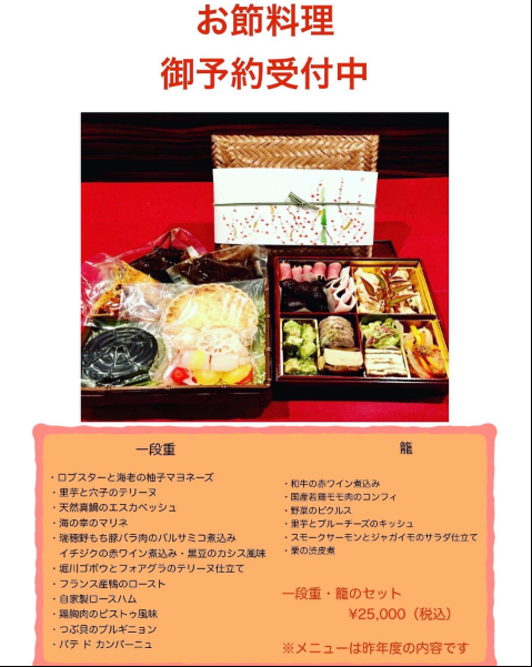なお、おせち料理は50個限定につき、なくなり次第終了となりますのでお早めに店舗にお問い合わせくださいませ。 今年度より、発送での対応も可能となりました。(関東〜九州の地域に限ります)