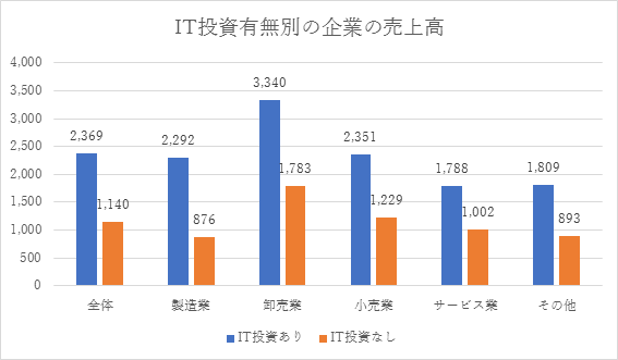 ご覧の通り、IT投資をしているという企業は、投資が無い企業に比べ、売上高、利益率共に全ての業種で高いということです。